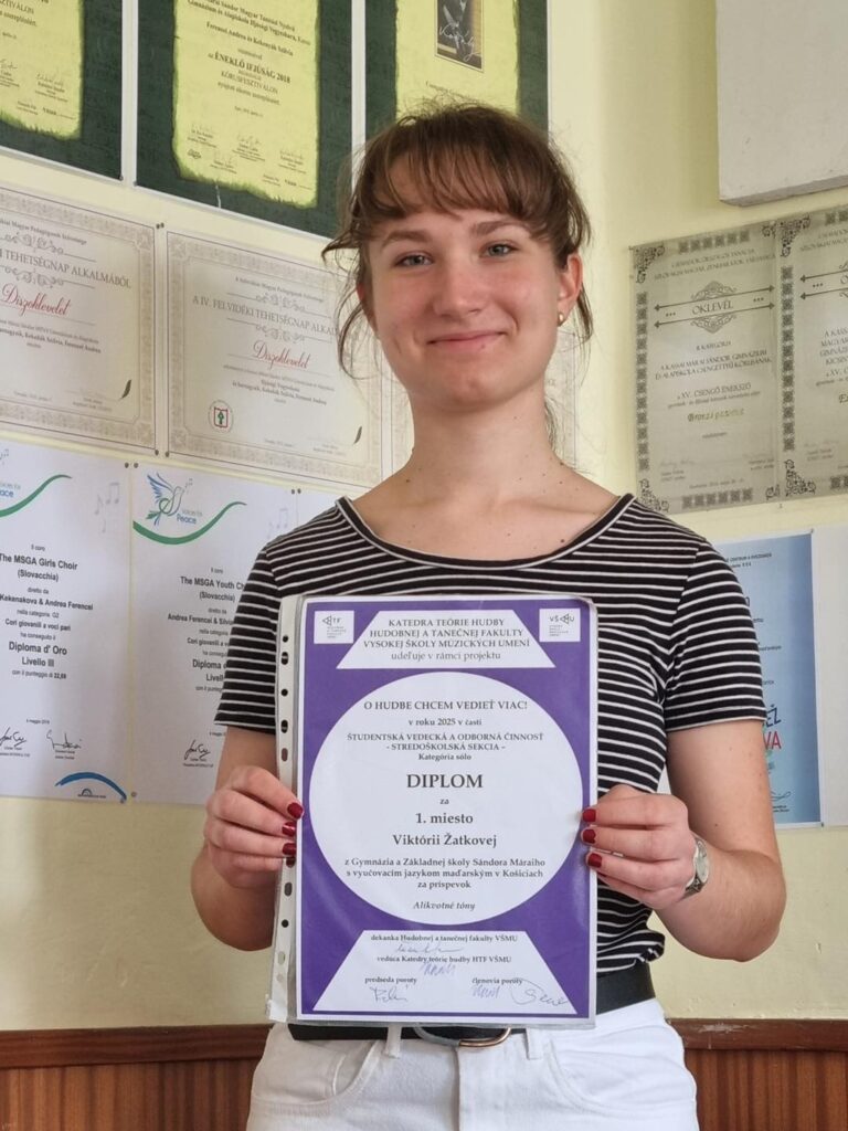 Žatko Viktória 1. díjat nyert a Pozsonyi Zeneművészeti Főiskola által szervezett országos zeneelméleti versenyen. Viki az első diákunk, aki ilyen versenyen ennyire kimagasló eredményt tudott elérni.